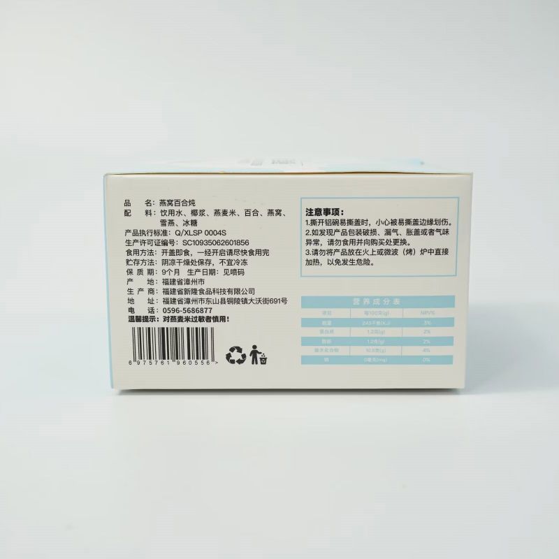 Ingrediente: Acqua potabile, latte di cocco, farina d'avena, giglio, nido d'uccello, rondine di neve, zucchero di roccia